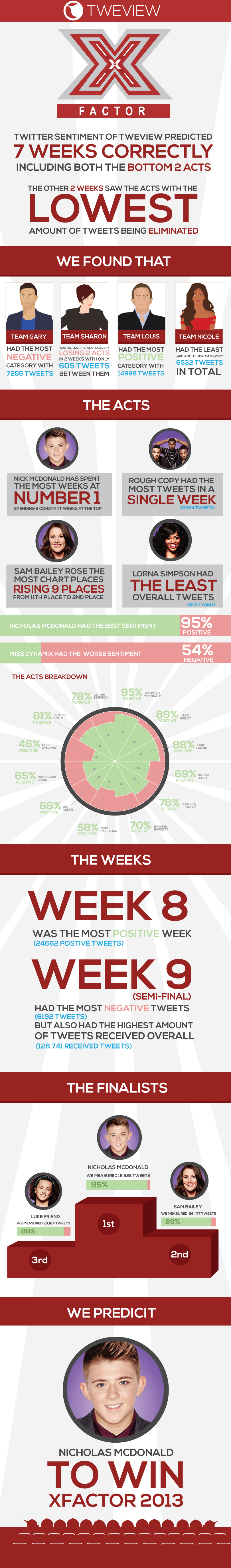 Twitter analytics service Tweview thinks it knows and has throughout this years X Factor succesfully predicted the bottom acts each week and now says that based on sentiment on Twitter Nicholas McDonald will win.