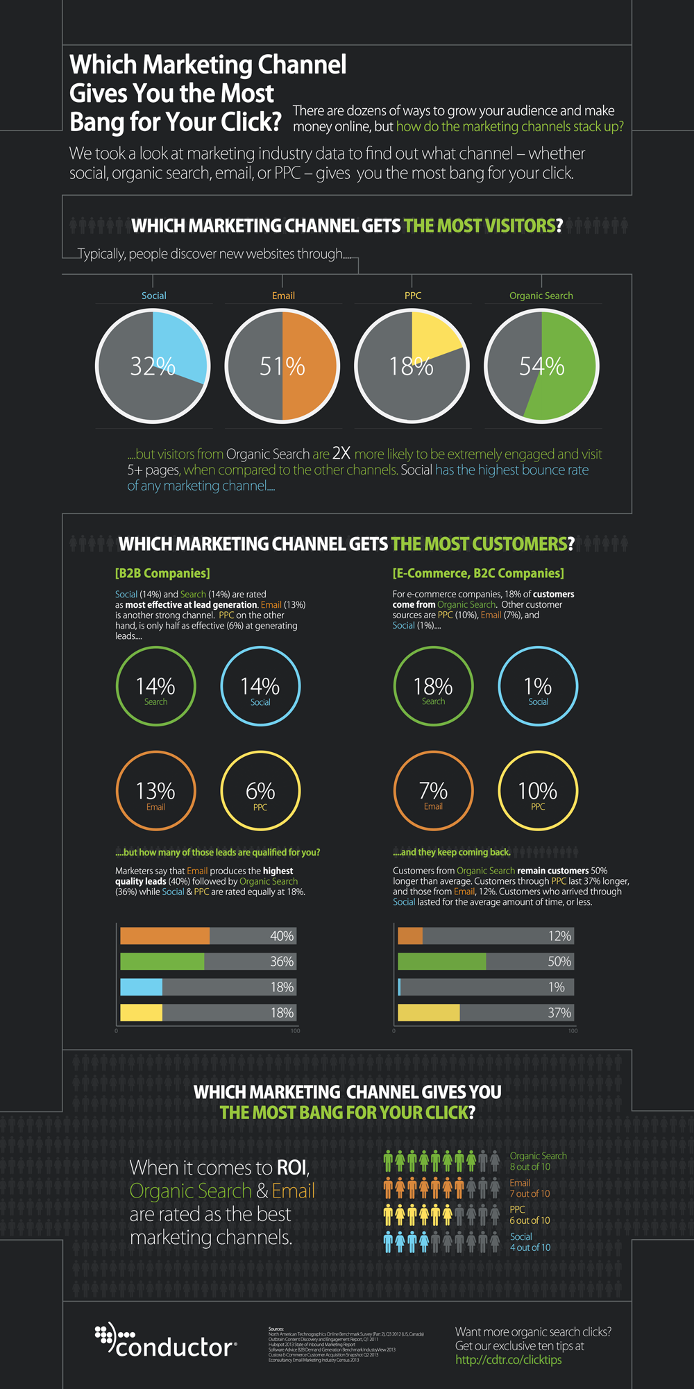 This infographic compares social media, organic (search engine), email marketing and PPC (pay-per-click advertising). It also usefully looks at differences between B2B and B2C.