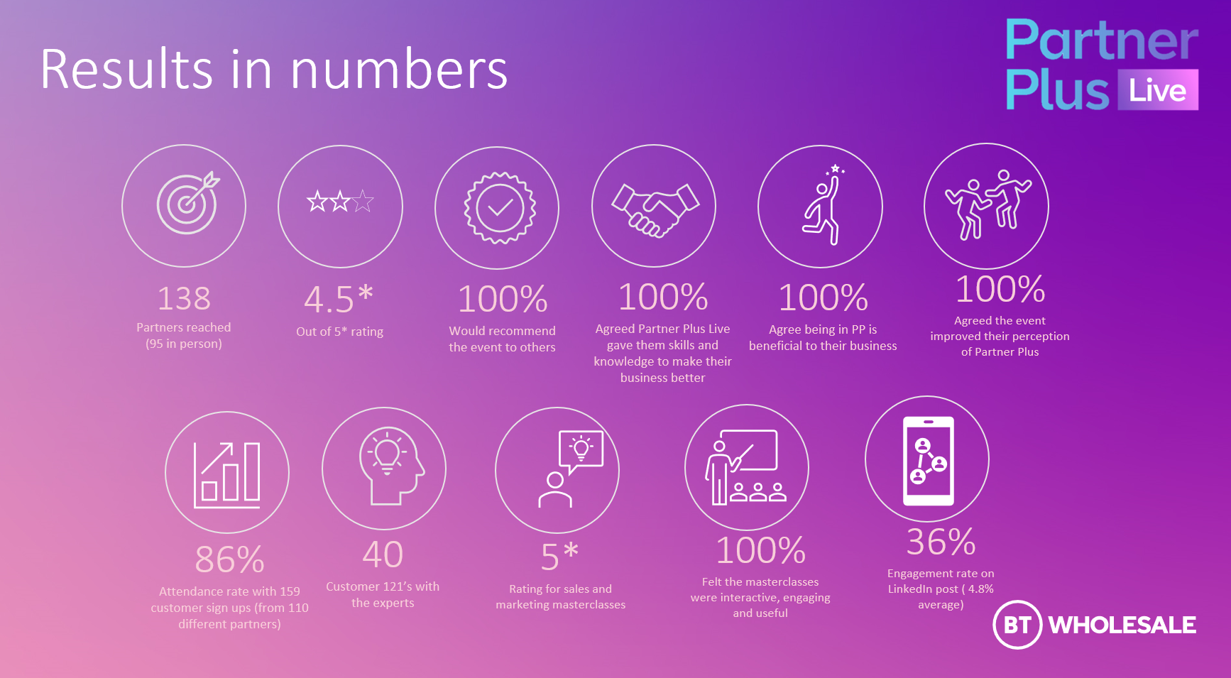 On all key measurements Partner Plus Live has consistently scored high, helping improve attendees perception of BT Wholesale and fantastic levels of satisfaction by attendees in the partner programme.